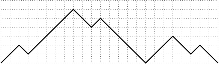 Le $a$ code un pas montant, et le $b$ un pas descendant. Le mot est reconnu si le chemin ne croise jamais l'axe horizontal et termine dessus. Ce graphique représente donc le mot $aabaaaaabbabbbbbaaabbabb$.