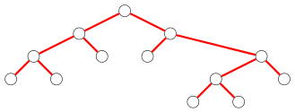 On peut maintenant reconstruire un arbre binaire à partir de ce mot. Notons qu'il y a deux parcours possibles, et qu'on peut aussi lire un mot de Dyck de droite à gauche, ce qui donne 4 correspondances différentes.