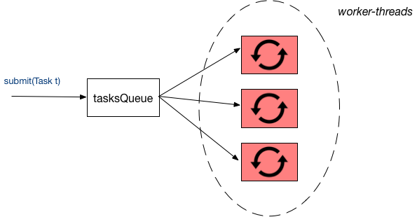 Un objet FixedThreadPool est créé avec un nombre poolSize qui correspond au nombre de worker threads. La méthode submit permet d'ajouter des tâches à exécuter par les worker threads.