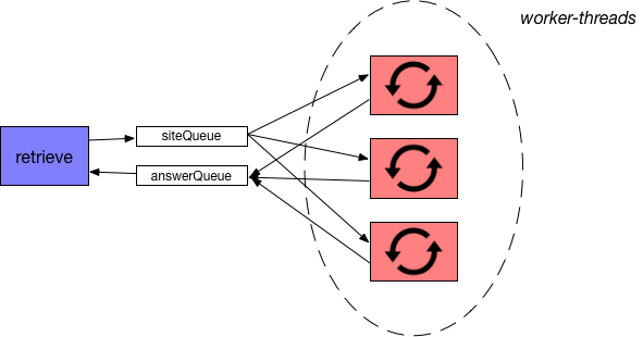 L'idée est que les worker threads vont, en boucle, exécuter des requêtes sur les différents sites et communiquer la réponse au thread qui exécute la méthode retrieve. Bien sûr, on ne veut pas que deux worker threads effectuent une requête pour le même site.