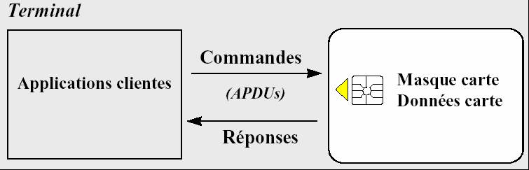 La carte communique avec le terminal via des commandes/réponses APDU (voir norme) traitées directement par le masque de la carte. Ce dernier lit, écrit et met à jour les données contenues dans l'EEPROM.