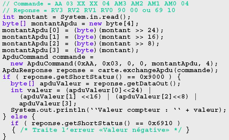 - le codage et l'envoi d’APDUs de commande conformes à ceux traités par l’applet