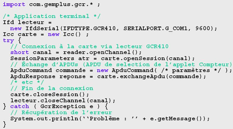 Comme il n'existe pas d'API de communication standard, on utilisera celle fournie par Gemplus
