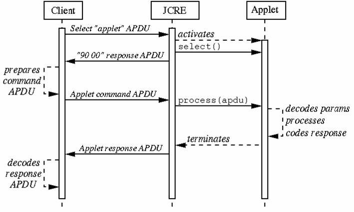 L'application cliente envoit toujours des commandes APDU mais ce sont les applets Java présentes sur la carte qui les traitent. Les applets quand à elles sont exécutées par le JCRE (Java Card Runtime Environment ou Envirronement d'exéction JavaCard) via l'API JavaCard. Ceci permet donc d'adapter la carte aux applications clientes en lui chargeant l'applet correspondante.