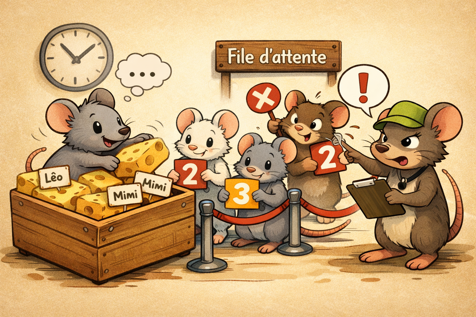 Les souris qui vivent dans votre immeuble font des provisions pour l’hiver en stockant du fromage dans une boîte. La boîte a une taille fixe N > 0, et les souris peuvent stocker au maximum N morceaux de fromage en même temps. Quand une souris ajoute un morceau de fromage, elle le dépose au fond de la boîte, après tous les autres, avec une petite étiquette à son nom.Lorsqu’une souris a un petit creux, elle vient prendre le premier fromage de la boîte, quelle que soit l’étiquette qu’il porte. Si la boîte est vide, la souris repart sans fromage.