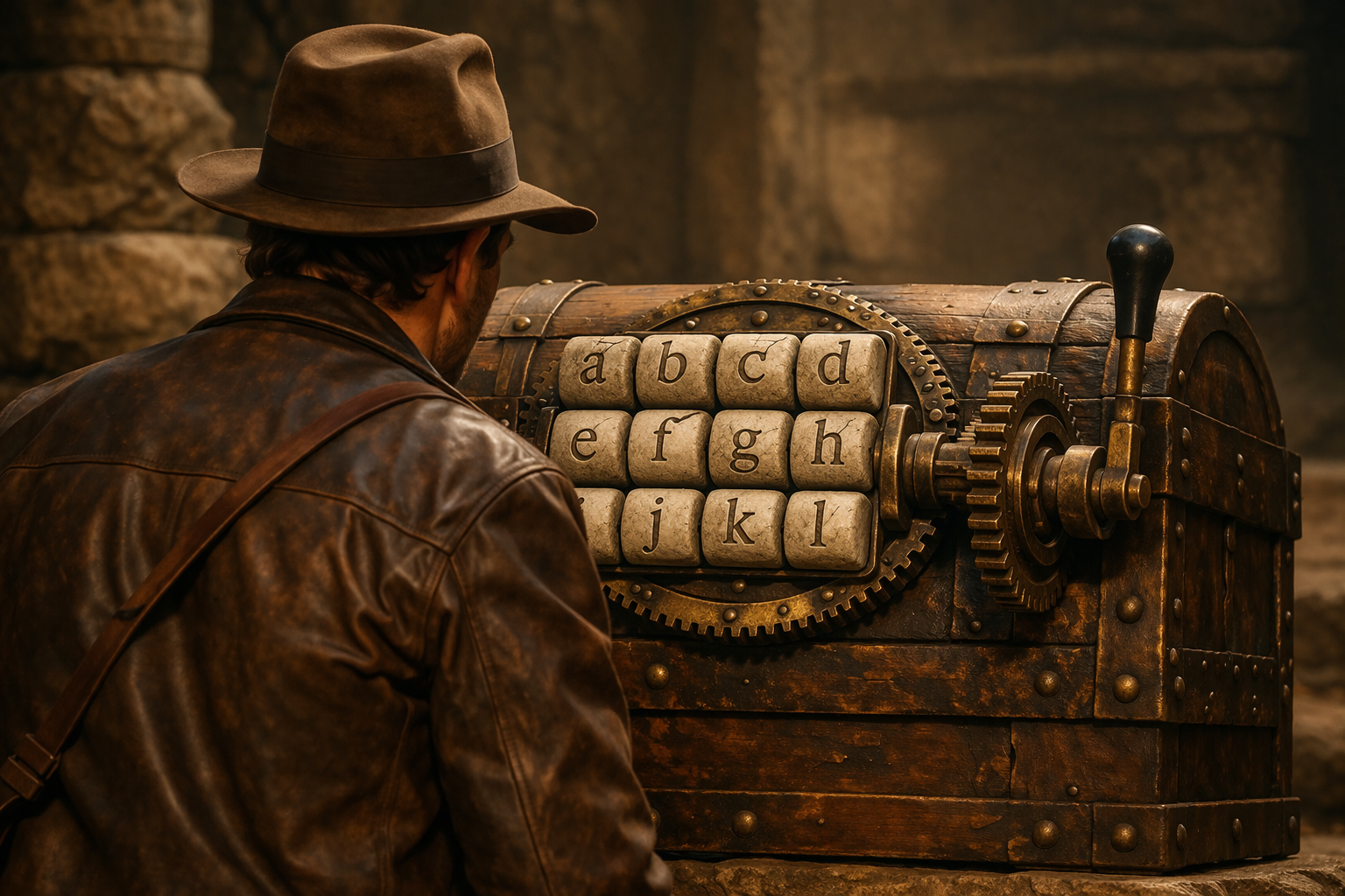 Une dernière énigme vous attend avant de pouvoir accéder au grimoire tant convoité : il y a une combinaison sur le coffre. Sur le couvercle se trouve un mécanisme rotatif sur lequel est gravé une grille de caractères en minuscules. Un petit levier permet de décaler toutes les lignes d’un cran vers le haut (de façon cyclique) à chaque fois qu’on l’actionne : la première ligne devient la dernière, la seconde devient la première, et ainsi de suite jusqu’à la dernière ligne, qui devient l’avant-dernière. Par exemple, si les lignes sont “abcd” et “efgh” et “ijkl”, actionner le levier les décale en “efgh” sur la première ligne, suivie “ijkl” et enfin “abcd”.